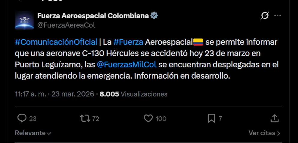 “La Fuerza Aeroespacial se permite informar que una aeronave C-130 Hércules se accidentó hoy 23 de marzo en Puerto Leguízamo. Las Fuerzas Militares se encuentran desplegadas en el lugar atendiendo la emergencia. Información en desarrollo”, señaló la institución a través de su cuenta en X.