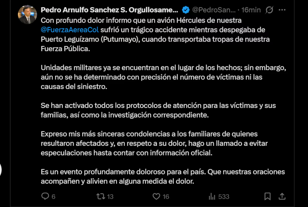 “Con profundo dolor informo que un avión Hércules de nuestra Fuerza Aérea sufrió un trágico accidente mientras despegaba de Puerto Leguízamo (Putumayo), cuando transportaba tropas de nuestra Fuerza Pública. Unidades militares ya se encuentran en el lugar de los hechos; sin embargo, aún no se ha determinado con precisión el número de víctimas ni las causas del siniestro”, manifestó el funcionario.