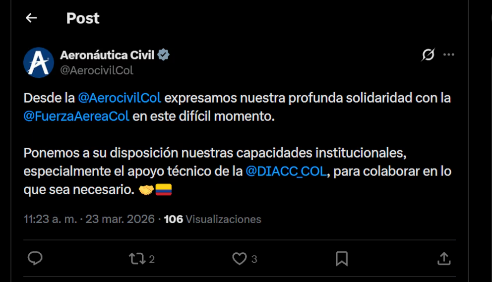 “Desde la Aeronáutica Civil expresamos nuestra profunda solidaridad con la Fuerza Aérea Colombiana en este difícil momento. Ponemos a disposición nuestras capacidades institucionales, especialmente el apoyo técnico de la Dirección Técnica de Investigación de Accidentes”, indicó la entidad.