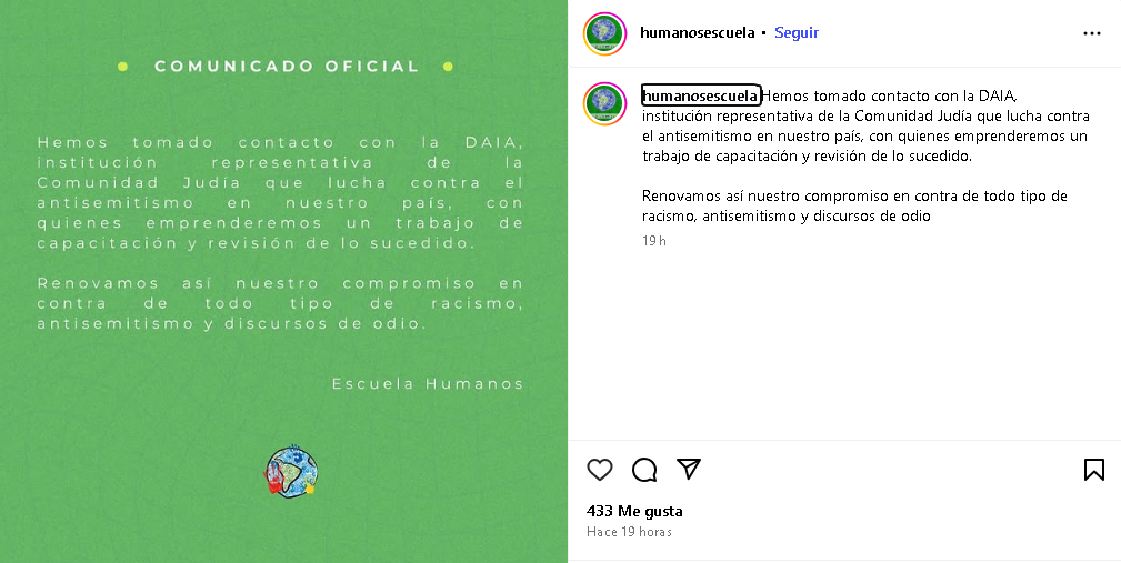 Horas más tarde, el colegio publicó un segundo mensaje en el que detalló: “Hemos tomado contacto con la DAIA, institución representativa de la Comunidad Judía que lucha contra el antisemitismo en nuestro país, con quienes emprenderemos un trabajo de capacitación y revisión de lo sucedido”. El texto cerró con una reafirmación: “Renovamos así nuestro compromiso en contra de todo tipo de racismo, antisemitismo y discursos de odio”.
