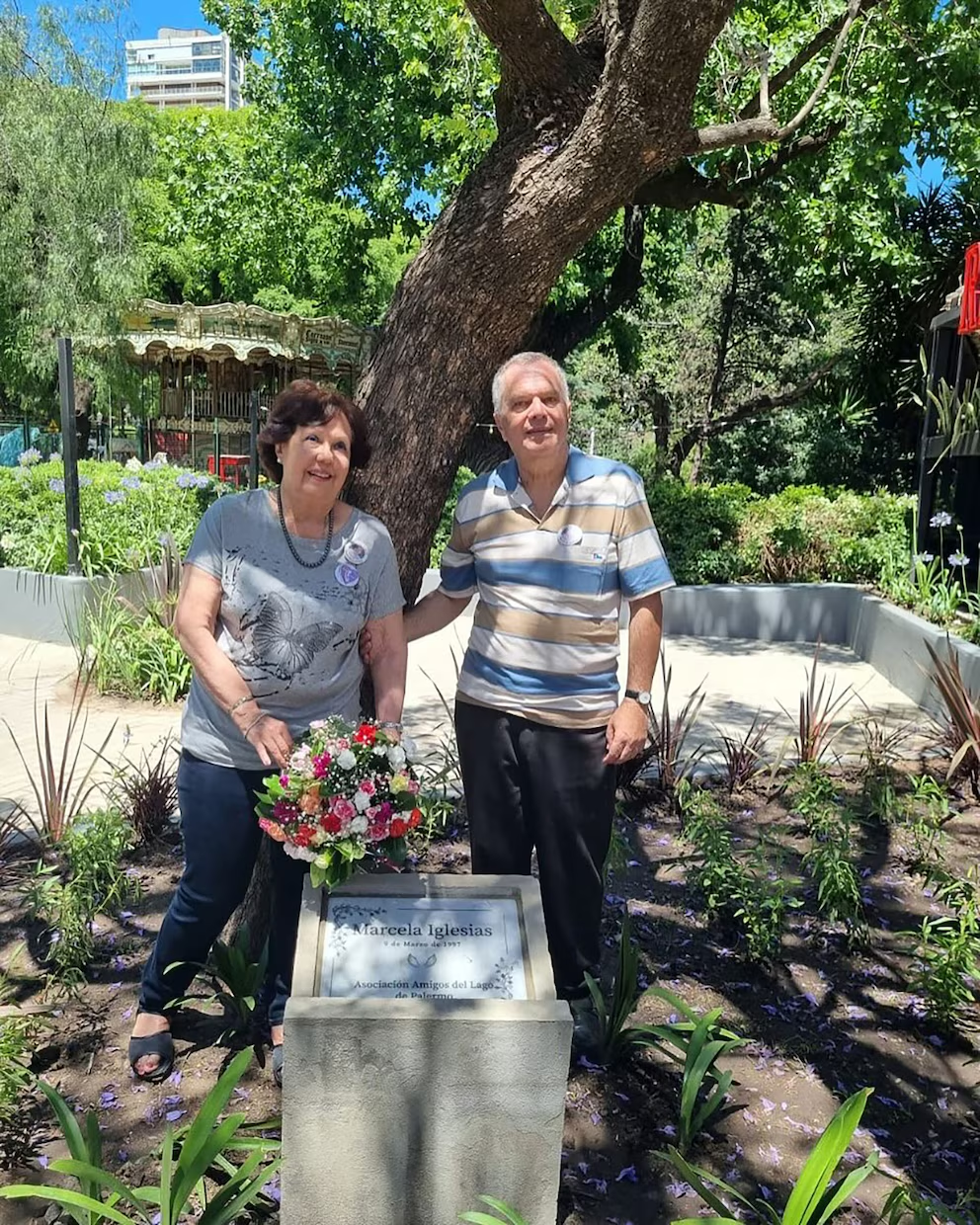 Nora Ester Ribaudo y Eduardo Rubén Iglesias, los padres de la víctima junto a la placa que recuerda a su hija en el ex Paseo de la Infanta (@victimasba).
