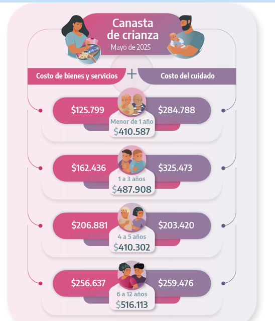 • 👶 0 a 1 año: $410.587 (de los cuales $125.799 son bienes y servicios, y $284.788 por cuidado).