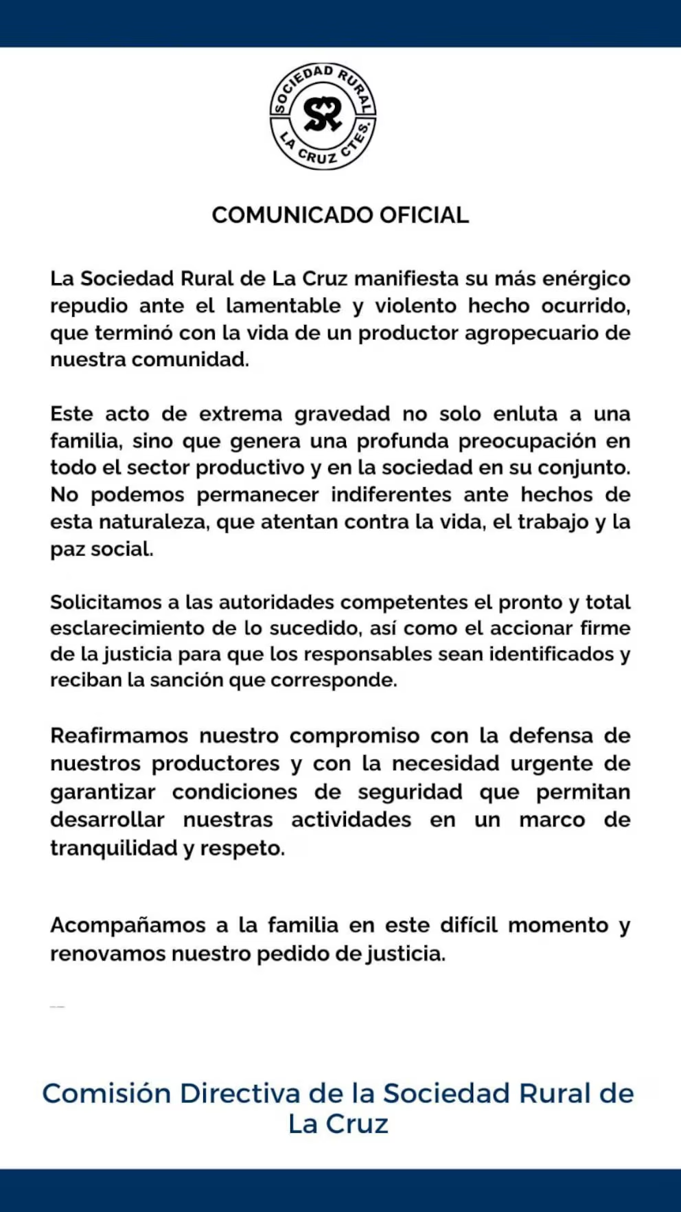 “La Sociedad Rural de La Cruz manifiesta su más enérgico repudio ante el lamentable y violento hecho ocurrido, que terminó con la vida de un productor agropecuario de nuestra comunidad”, expresaron en el inicio del texto.