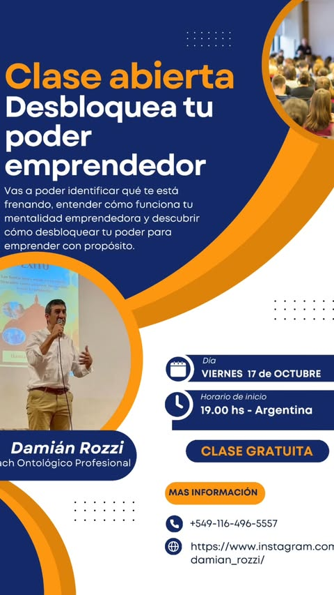 Una nueva propuesta dirigida a quienes buscan potenciar su mentalidad emprendedora se realizará este viernes 17 de octubre a las 19.00 (hora de Argentina). Se trata de una clase abierta y gratuita titulada “Desbloquea tu poder emprendedor”, que brindará el coach ontológico profesional Damián Rozzi, autor del libro “Auténtico Éxito”.