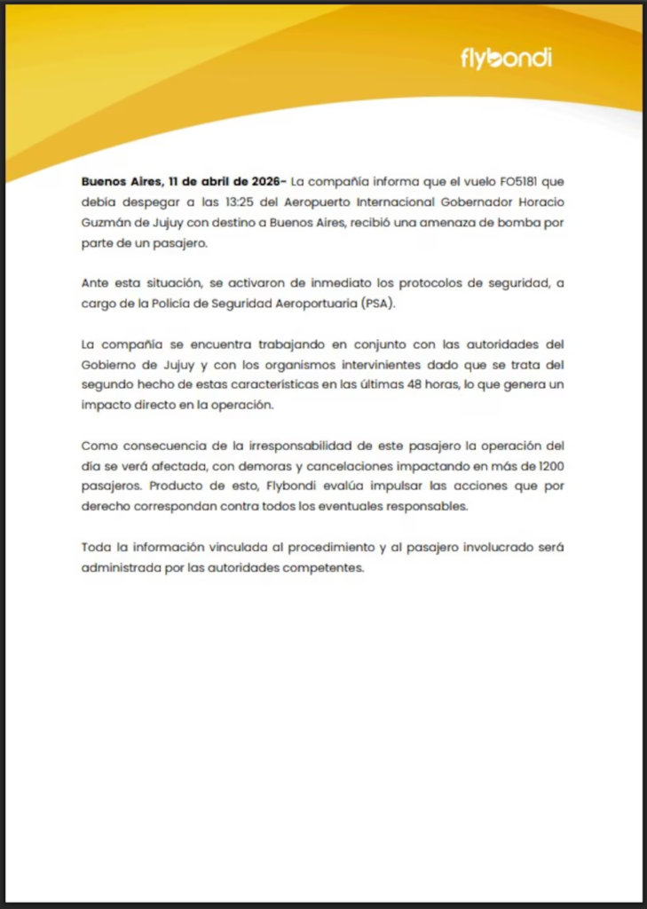 Horas después, la aerolínea Flybondi difundió un comunicado oficial en el que brindó precisiones sobre lo ocurrido. La empresa indicó que el vuelo FO5181, programado para despegar a las 13:25 desde el Aeropuerto Internacional Gobernador Horacio Guzmán con destino a Buenos Aires, recibió una amenaza de bomba por parte de un pasajero.