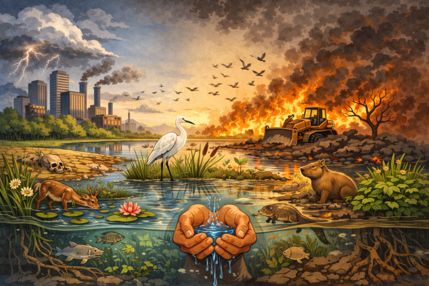 El cambio climático agrava todo. Los humedales son grandes aliados en la lucha contra el calentamiento global: almacenan enormes cantidades de carbono, incluso más que muchos bosques. Cuando se los destruye o se los quema, ese carbono se libera a la atmósfera, acelerando el problema que supuestamente queremos frenar. Es un círculo vicioso perfecto… y peligroso.
