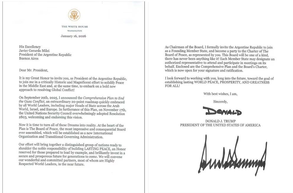 Según explicó el propio Presidente, la invitación se formalizó mediante una carta enviada por Donald Trump. En el texto, el mandatario estadounidense manifestó: “Es un gran honor para mí invitarle, como presidente de la República Argentina, a unirse a mí en un esfuerzo histórico y magnífico para consolidar la paz en Oriente Medio y, al mismo tiempo, emprender un nuevo y audaz enfoque para resolver el conflicto global”.