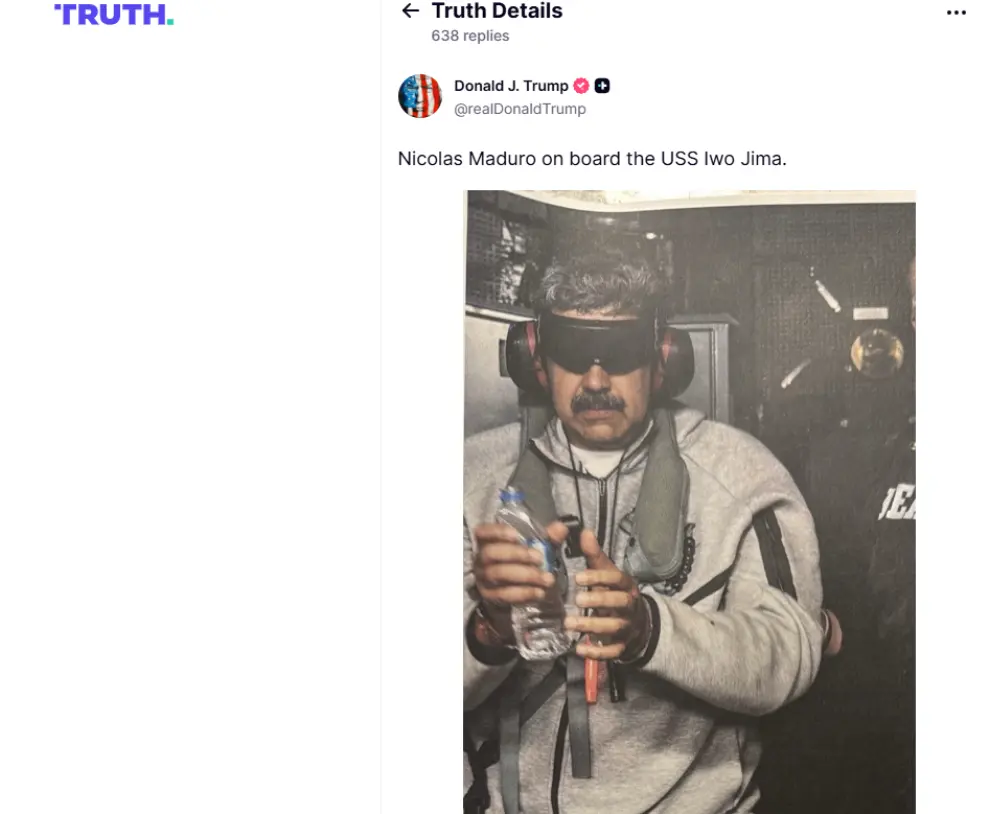 Trump acompañó la imagen con comentarios que celebran la captura, describiendo el hecho como un hito histórico en la lucha contra el régimen de Maduro. La foto publicada también refuerza la narrativa de que Estados Unidos ejerció un control total sobre la operación, mostrando al exmandatario bajo custodia en aguas internacionales.