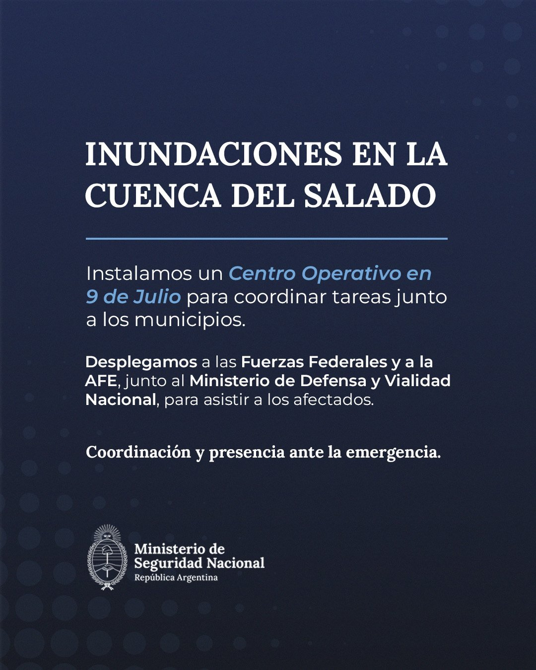 La ministra de Seguridad, Patricia Bullrich, anunció este miércoles que el Gobierno nacional instalará un centro de operaciones en el municipio bonaerense de 9 de Julio con el objetivo de brindar asistencia a los distritos del interior afectados por las inundaciones provocadas por el desborde de la Cuenca del Río Salado.