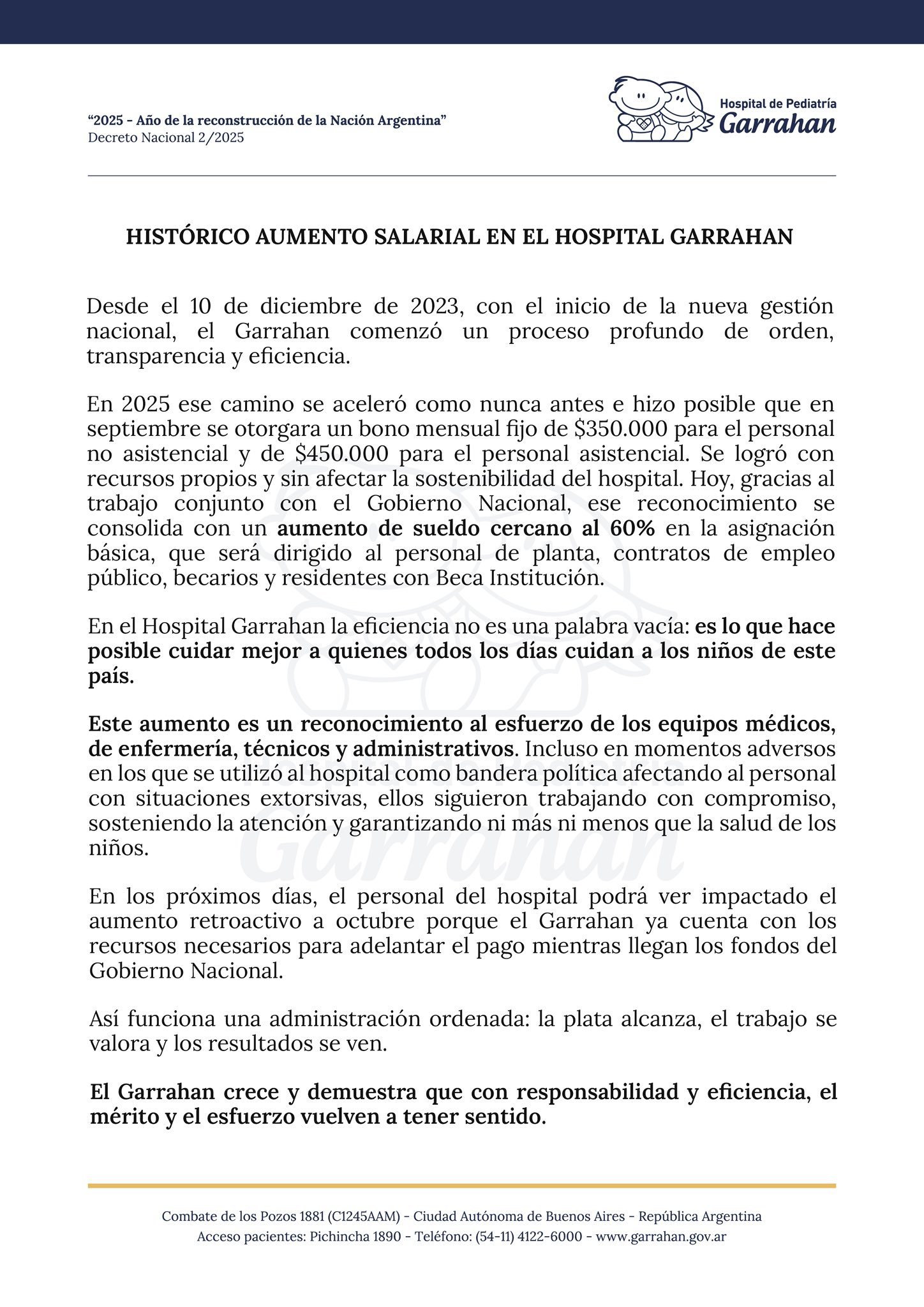 “El incremento salarial constituye un reconocimiento al esfuerzo de los equipos médicos, de enfermería, técnicos y administrativos”, destacó el comunicado, que también remarcó: “La eficiencia no es una palabra vacía: es lo que hace posible cuidar mejor a quienes todos los días cuidan a los niños de este país”.