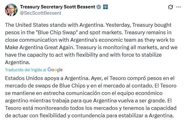 “El Tesoro estadounidense se encuentra monitoreando todos los mercados y dispone de la capacidad para actuar con flexibilidad y fuerza con el objetivo de estabilizar Argentina”, publicó Bessent, quien expresó además el respaldo de Washington al Gobierno nacional al afirmar: “Estados Unidos está con Argentina”.
