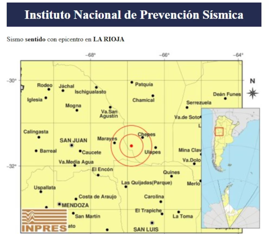 El fenómeno ocurrió durante la tarde, a las 14:13, y tuvo su epicentro a 36 kilómetros al sudoeste de la localidad de Chepes, en territorio riojano. De acuerdo con los datos oficiales difundidos por el organismo, el temblor se produjo a una profundidad de 135 kilómetros.