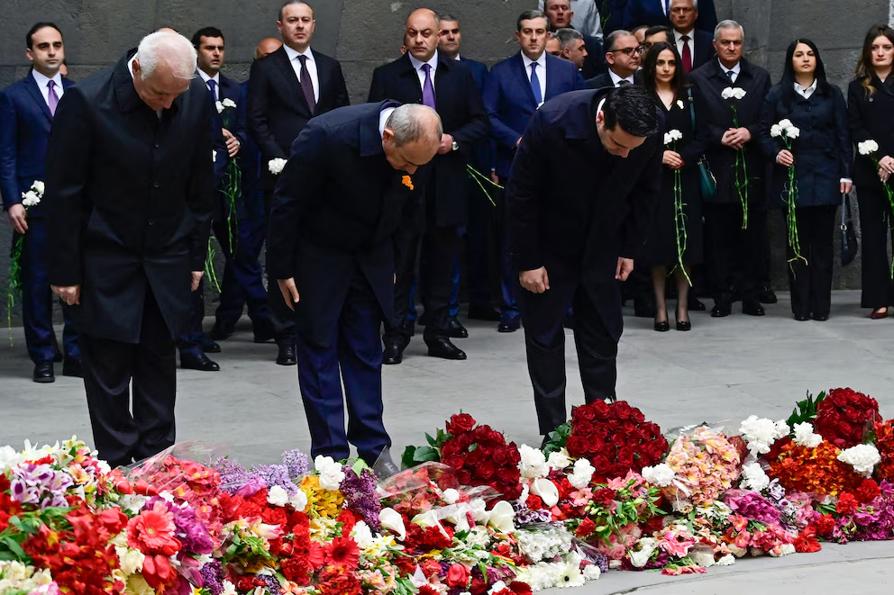 El presidente de Armenia, Vahagn Khachaturyan, el primer ministro armenio, Nikol Pashinyan, y el presidente de la Asamblea Nacional de Armenia, Alen Simonyan, depositaron flores en el Monumento al Genocidio Armenio de Tsitsernakaberd en Ereván, el 24 de abril de 2026, con motivo del Día de la Conmemoración del Genocidio, para recordar el 111.º aniversario de las masacres de armenios perpetradas por el Imperio Otomano en 1915, durante la Primera Guerra Mundial. Foto AFP