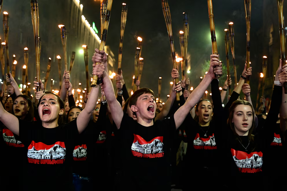 Durante una manifestación en la capital, cientos de jóvenes recorrieron las calles con antorchas para exigir mayor reconocimiento internacional del genocidio, una calificación aceptada por más de dos docenas de países pero rechazada de forma categórica por Turquía.