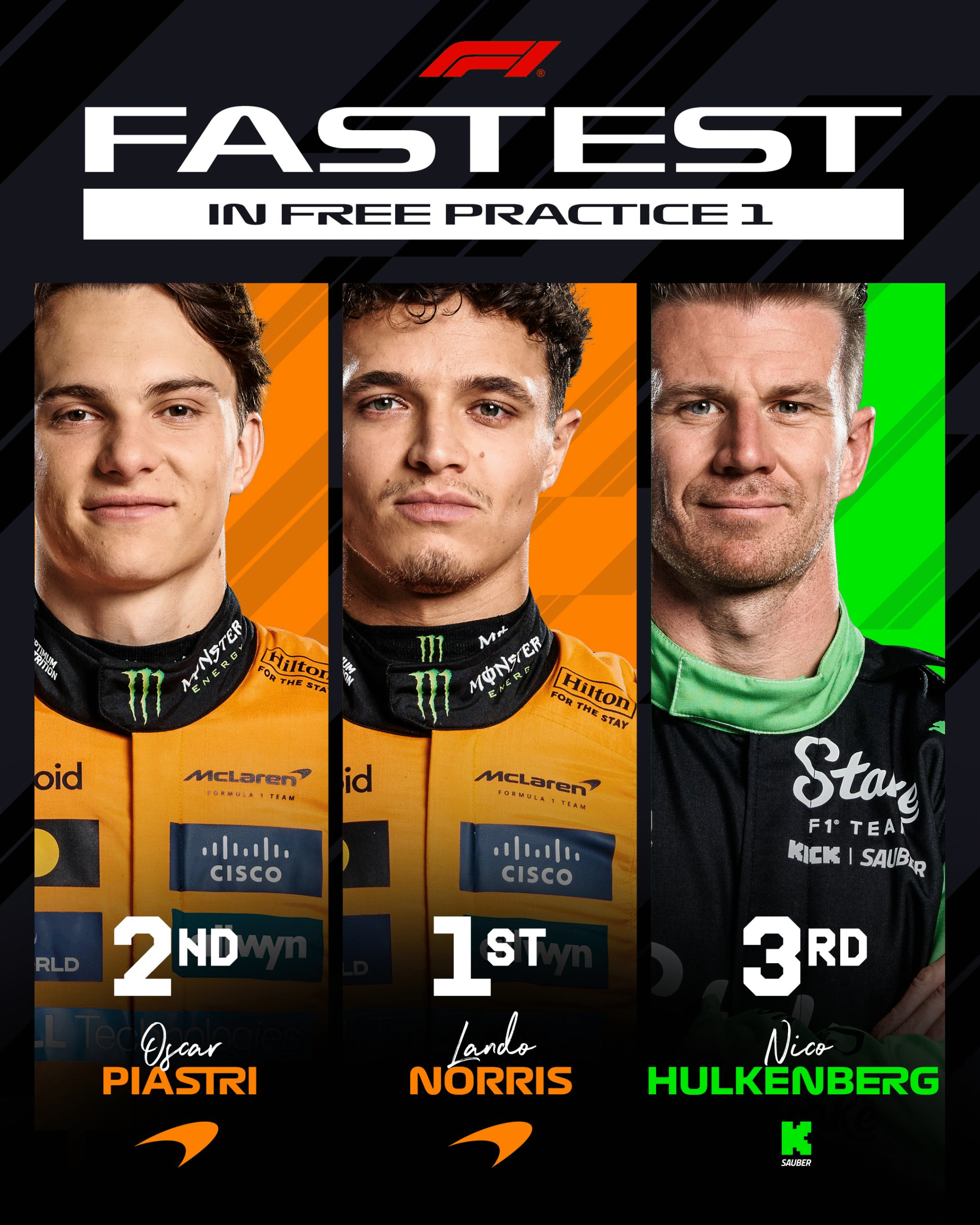 El mejor tiempo de la tanda fue para Lando Norris, quien marcó 1:09.975 en su última vuelta. Detrás se ubicaron Oscar Piastri y Nico Hülkenberg, completando el trío de punta. Por su parte, Colapinto giró en 1:11.160, quedando justo detrás de su compañero Pierre Gasly (1:10.681).