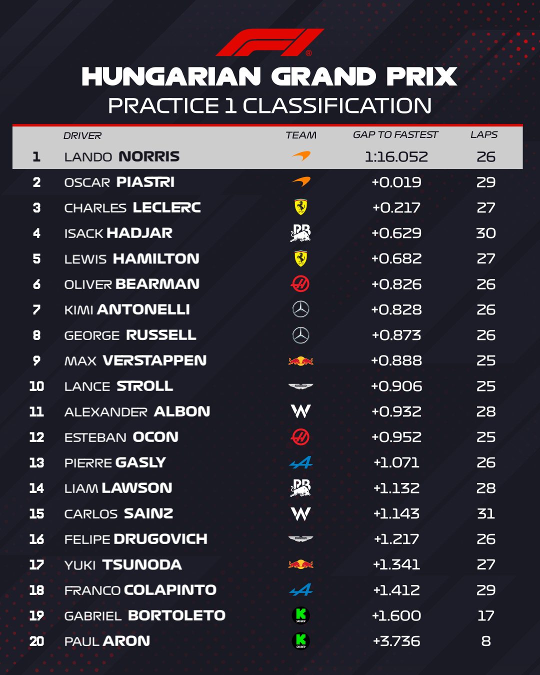 Posiciones finales de la FP1 del Gran Premio de Hungría: