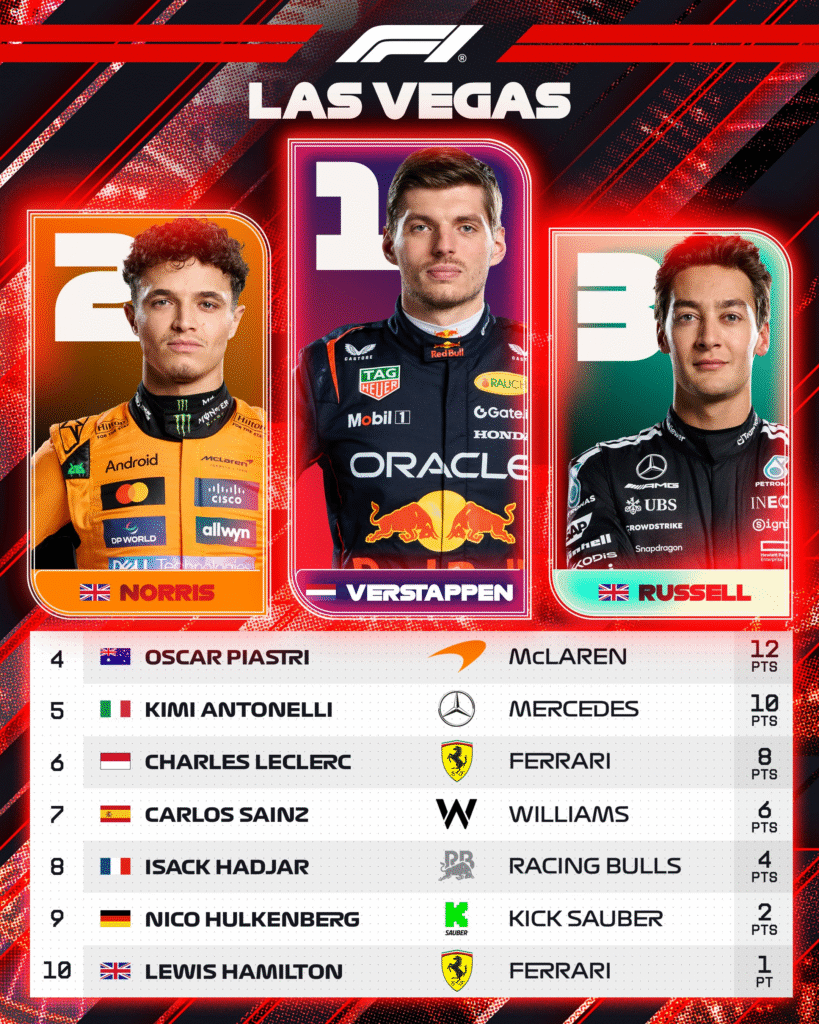 La noche del Gran Premio de Las Vegas de Fórmula 1 dejó una nueva exhibición de Max Verstappen, quien se quedó con una victoria incuestionable y sumó unidades que revitalizan sus aspiraciones en el campeonato. En contraste, Franco Colapinto finalizó en el 17° lugar, dos posiciones por detrás de su puesto de partida, tras lidiar durante las 50 vueltas con un Alpine seriamente perjudicado. El argentino sufrió un toque en la largada que rompió su difusor y comprometió el balance del auto, una condición que terminó marcando toda su actuación.