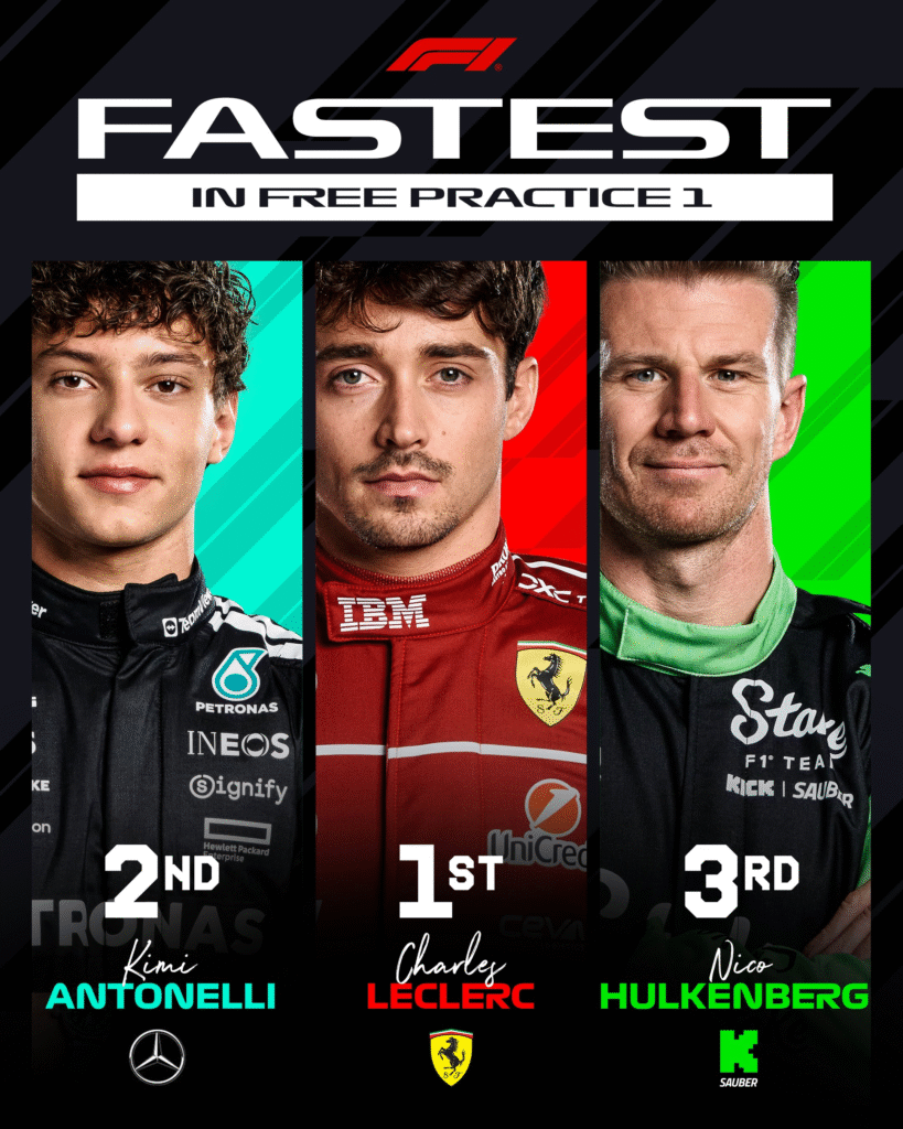 El mejor registro general de la FP1 fue para Charles Leclerc (Ferrari), con 1:18.380. Detrás se ubicaron Kimi Antonelli (Mercedes), Nico Hülkenberg (Stake), Oscar Piastri (McLaren) y Gabriel Bortoleto (Stake), completando los cinco primeros lugares.