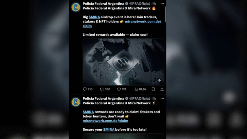 La cuenta oficial de la Policía Federal Argentina (PFA) en la red social X fue hackeada este viernes para promocionar una criptomoneda. Durante algunos minutos, se publicaron mensajes que invitaban a un supuesto “airdrop” de la moneda virtual $MIRA, con textos en inglés que llamaban a “unirse a traders, stakers y tenedores de NFT para reclamar recompensas limitadas”