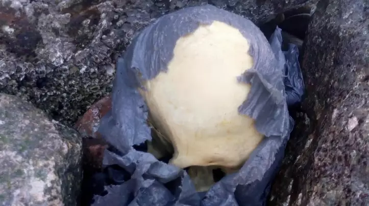 Un cráneo humano fue encontrado en la tarde de este jueves en Playa Unión, en la zona de la escollera grande de la ciudad, luego de que un grupo de vecinos advirtiera la presencia de una bolsa de nylon que contenía restos en su interior.