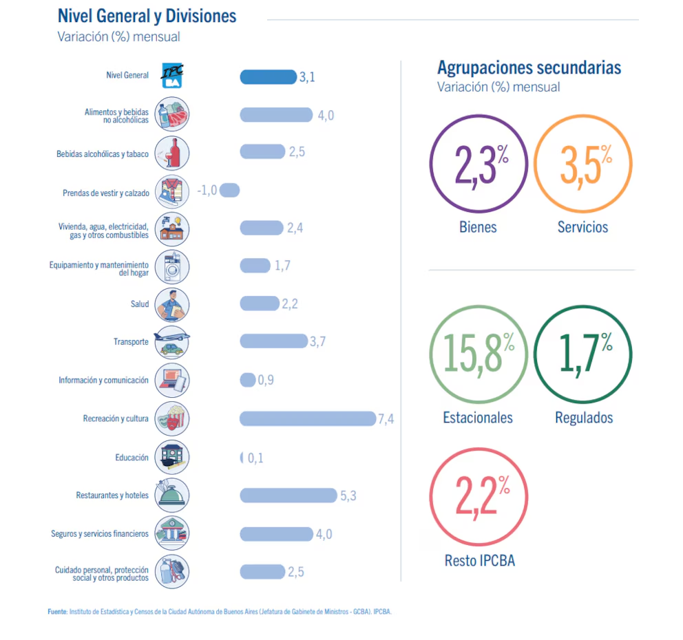 Según el Índice de Precios al Consumidor de la Ciudad de Buenos Aires (IPCBA), los mayores aumentos del mes se dieron en Recreación y Cultura, con una suba del 7,4%. Le siguieron Restaurantes y Hoteles, que avanzaron 5,3% impulsados por la temporada de vacaciones, Alimentos y Bebidas No Alcohólicas con un alza del 4%, el mismo porcentaje que Seguros y Servicios Financieros, y Transporte, que registró un incremento del 3,7%.