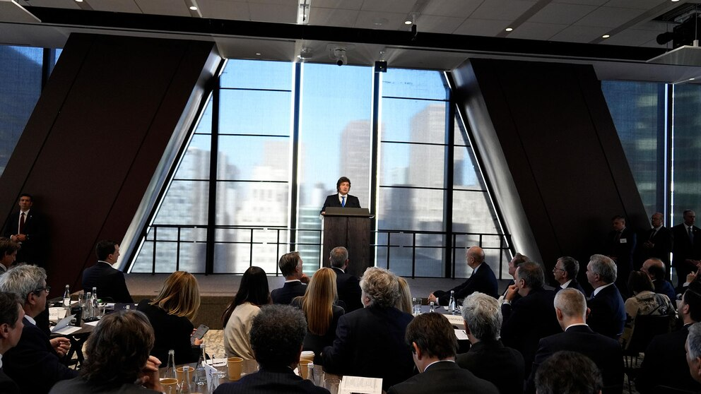 Javier Milei, presidente de Argentina, ante el seminario Argentina Week en Nueva York ante una audiencia de empresarios y líderes económicos. (Presidencia).