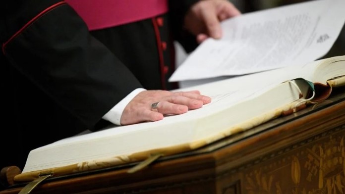 “Declaro emitir este juramento consciente de que una infracción del mismo comportaría para mí la pena de excomunión latae sententiae… Así Dios me ayude y estos Santos Evangelios que toco con mi mano”, dice uno de los pasajes centrales del texto suscrito.