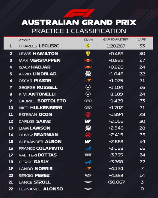 En cuanto al trabajo en pista, la sesión tuvo mucha actividad. La mayoría de los pilotos completó entre 28 y 32 vueltas, siendo Leclerc el que más giró con un total de 32. Los equipos aprovecharon la práctica para evaluar configuraciones, probar neumáticos y comenzar a recopilar datos clave para el resto del fin de semana.