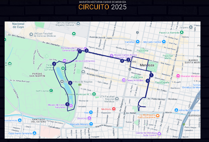 La largada y la llegada estarán ubicadas en la explanada de Casa de Gobierno. Desde allí, el pelotón avanzará por La Pampa, Mitre, Plaza Independencia, Sarmiento y Emilio Civit, ingresando hacia los Portones del Parque General San Martín.