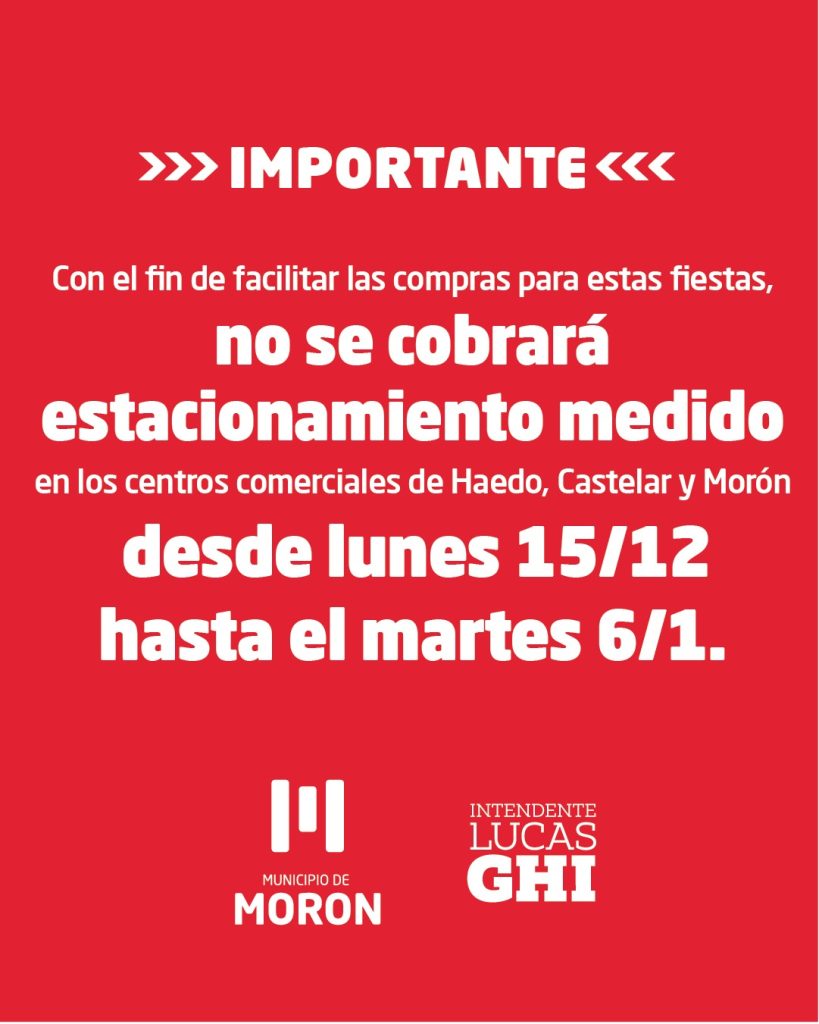 Como parte de las medidas de incentivo, el Municipio informó que hasta el 6 de enero no se cobrará estacionamiento medido en los centros comerciales de Haedo, Castelar y Morón, con el fin de facilitar el acceso a los locales y promover las compras en el comercio de cercanía.