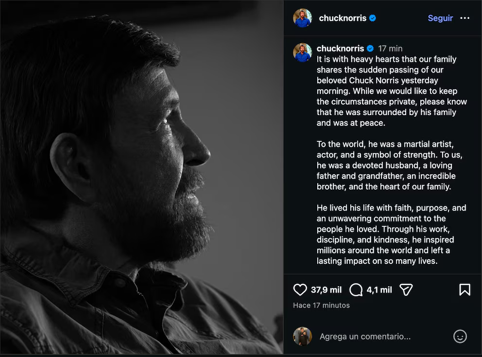“Con profunda tristeza compartimos el fallecimiento de nuestro querido Chuck. Si bien deseamos mantener en reserva las circunstancias, podemos decir que estaba acompañado por su familia y en paz”, señalaron. Además, remarcaron que, más allá de su figura pública, para ellos fue “un esposo devoto, padre y abuelo amoroso, y el corazón de la familia”.
