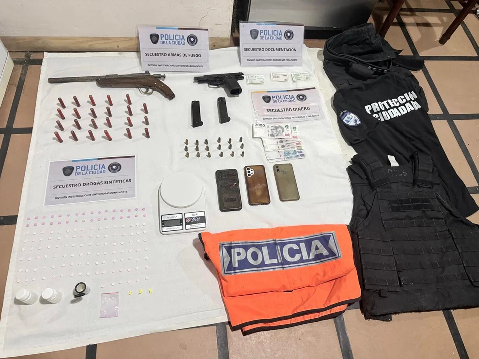 Durante el allanamiento se incautaron elementos vinculados a fuerzas de seguridad, como un chaleco refractario con la inscripción “Policía”, una funda para chaleco antibalas y una remera con la leyenda “Policía Ciudadana”. También se secuestraron una balanza de precisión, una pistola Bersa Thunder calibre 9 milímetros con 18 municiones y un pistolón Jaguar con 23 proyectiles.