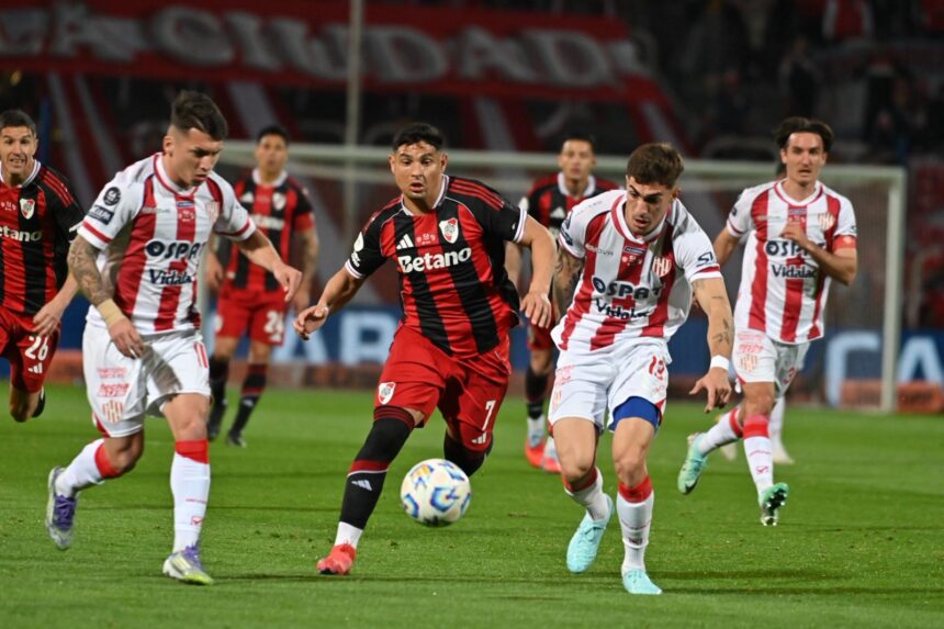 El partido comenzó con dominio repartido. A los 8 minutos, Giuliano Galoppo tuvo la primera chance con una volea que controló Matías Tagliamonte. Más tarde, a los 17, Mauricio “Caramelo” Martínez sorprendió con un disparo desde mitad de cancha que pasó cerca del arco de Franco Armani. A los 25, el arquero Tatengue anticipó a Maxi Salas en un mano a mano y, sobre los 35, el juego se volvió impreciso, sin llegadas claras.