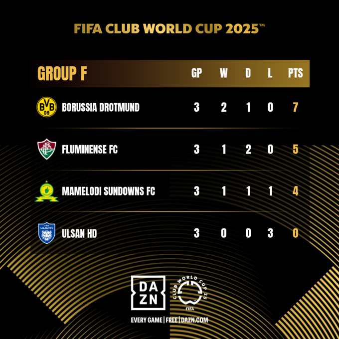 Borussia Dortmund venció a Ulsan Hyundai y se clasificó como líder del Grupo F; Fluminense empató con Mamelodi Sundowns y quedó segundo