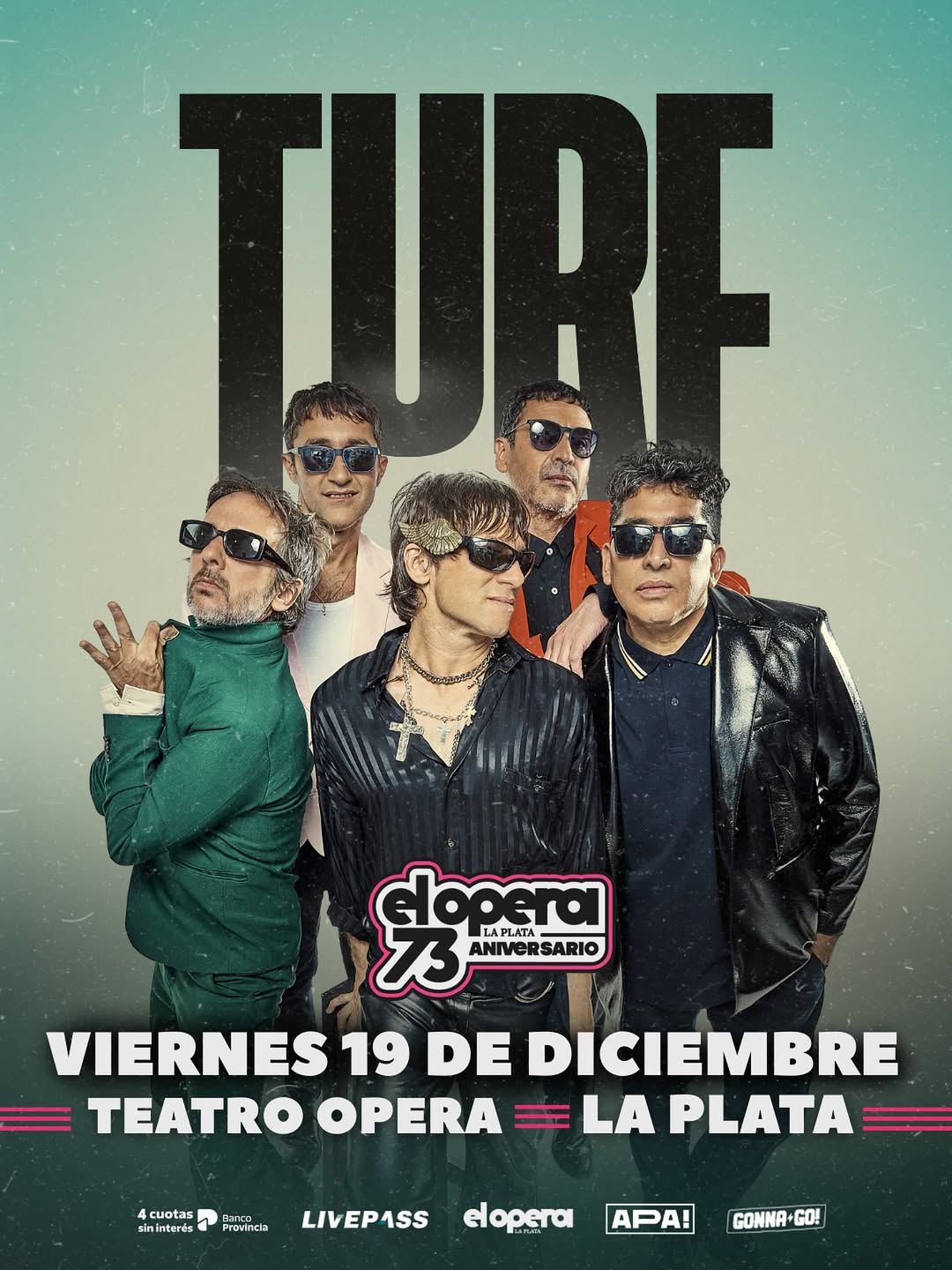 Con una energía imparable, Turf sigue recorriendo Argentina con una serie de presentaciones imperdibles. Entre los próximos shows se destacan La Feliz Fest en Mar del Plata el 18 de octubre, el Festival del Pejerrey en El Carmen (Jujuy) el 8 de noviembre, y el Festival Polenta en la Ciudad de Buenos Aires el 29 de noviembre. Luego, la banda dirá presente en la Fiesta Nacional de la Leche en Totoras (Santa Fe) el 6 de diciembre, antes de cerrar el año con un concierto muy especial en el Teatro Opera de La Plata el 19 de diciembre.