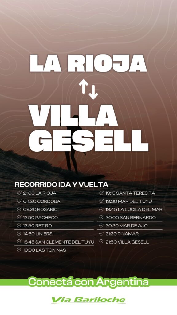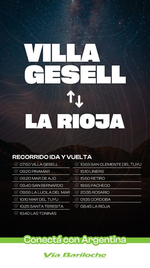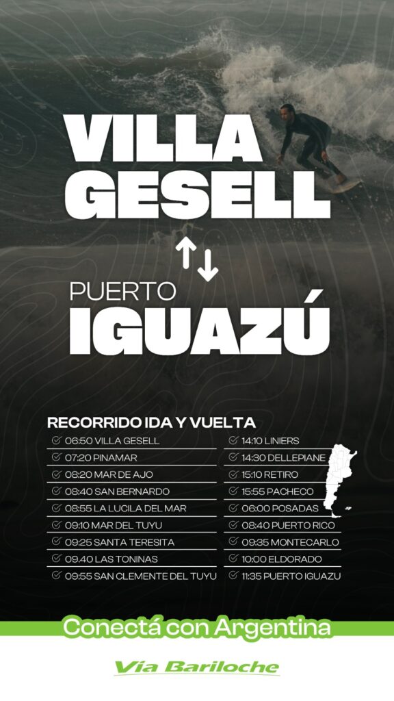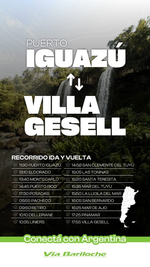 Por último, Vía Bariloche confirmó un extenso recorrido que unirá Puerto Iguazú con Villa Gesell. Este servicio contempla múltiples paradas intermedias, entre ellas Eldorado, Montecarlo, Puerto Rico, Posadas, Pacheco, Retiro, Dellepiane y Liniers, además de San Clemente del Tuyú, Las Toninas, Santa Teresita, Mar del Tuyú, La Lucila del Mar, San Bernardo, Mar de Ajó, Pinamar y, finalmente, Villa Gesell.